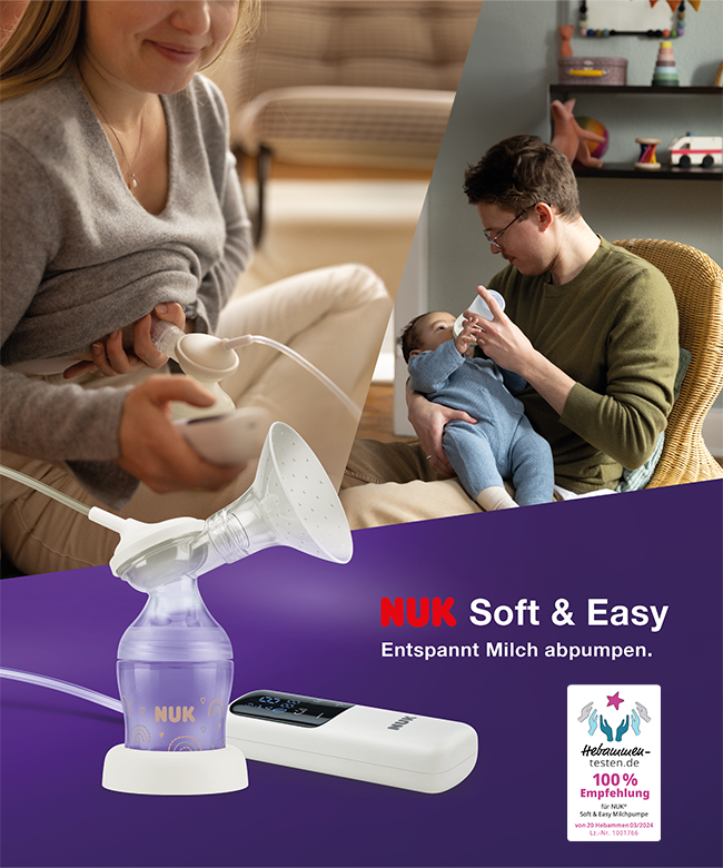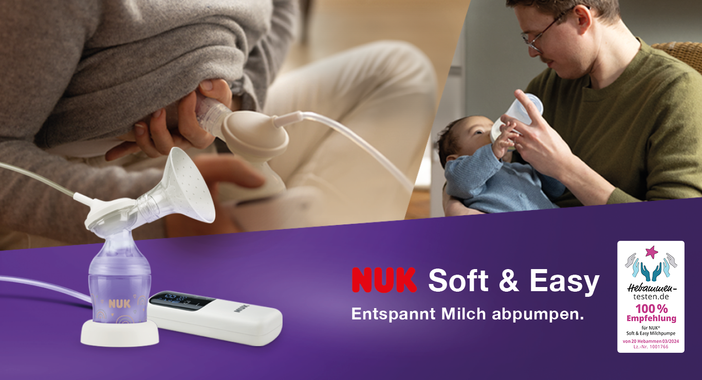 Mit der neuen NUK Soft & Easy Milchpumpe lässt sich Muttermilch entspannt zu Hause oder unterwegs abpumpen: Der Brustaufsatz besteht zu 100 % aus hautweichem Silikon, ohne Teile aus hartem Kunststoff. So ist er besonders sanft zur Brust. Es stehen zwei Größen für den Brustaufsatz zur Verfügung. Dank integriertem Akku ist die superleichte und leise Milchpumpe auch perfekt für den Einsatz unterwegs geeignet. Die Bedienung ist leicht und intuitiv: Zwei Berührungen auf dem Touch-Bedienfeld starten das Pumpen. Dabei gibt es drei wählbare Programme, die das natürliche Trinkverhalten des Babys simulieren. Zugleich kann die Saugstärke individuell an die persönlichen Bedürfnisse der Mutter angepasst werden. Die Eigenschaften der neuen Soft & Easy Milchpumpe (im Test war die Einzelpumpe) überzeugen: 100% der Hebammen sprechen eine Empfehlung aus!
